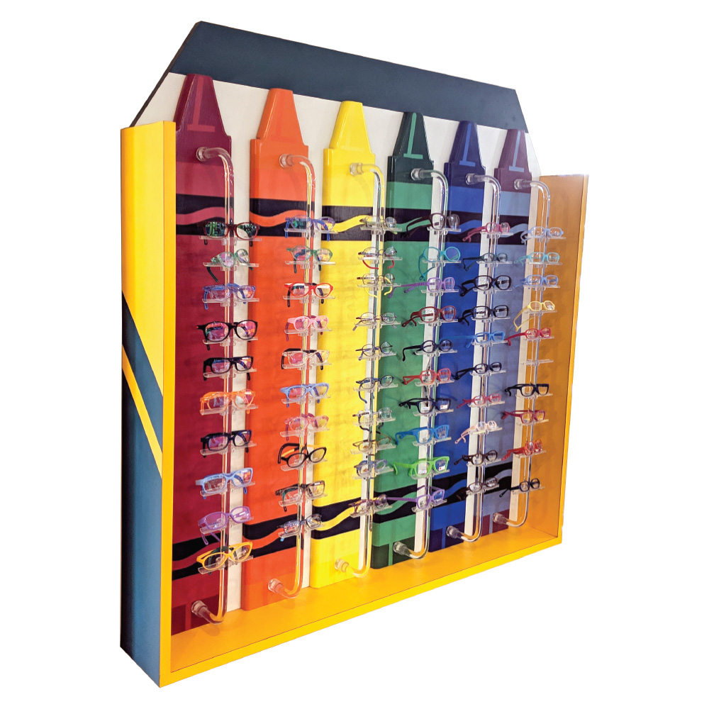 Our unique crayon displays will help your little patients feel more at home in your optical dispensary. The displays are custom made from 4-8 crayons! Using solid laminate surfaces, the displays holds anywhere from 60 to 120 frames. They are easy to clean and hold up to heavy use for decades. We also have single crayon accent displays available.