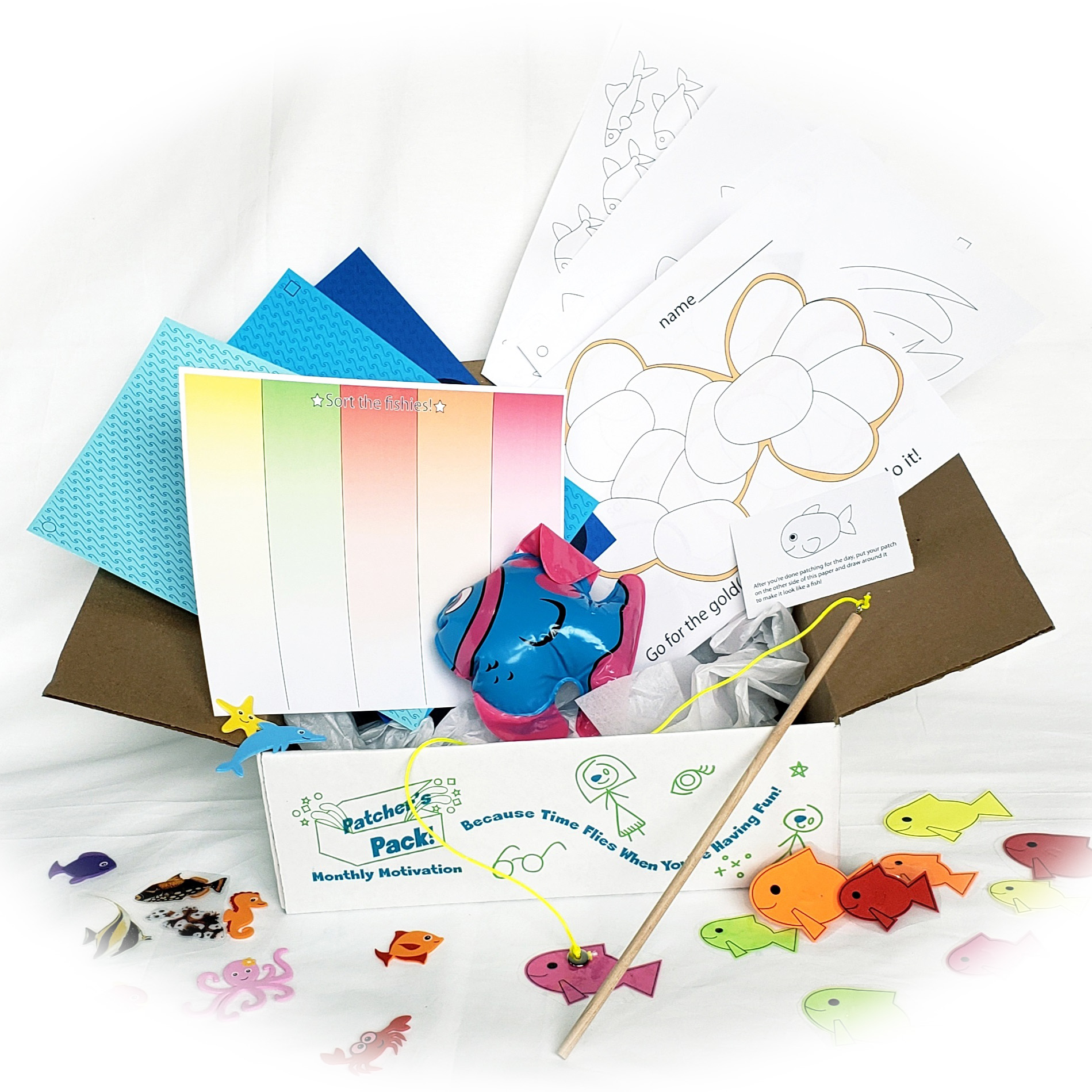 Patcher’s Pack is the newest project for Is It Gonna Hurt Publishers. It is monthly motivation mailed to the home of your patient. It’s not eye patches, but rather fun games and activities specifically designed to exercise the eye while patching. Each game and activity has 3 different levels of difficulty. No matter whether your patient has 20/30 vision or 20/400 vision, Patcher’s Pack has tasks geared toward their ability level. Our colorful cartons are delivered monthly with a new fun theme every month. This pack is also beneficial to your patients using atropine therapy.