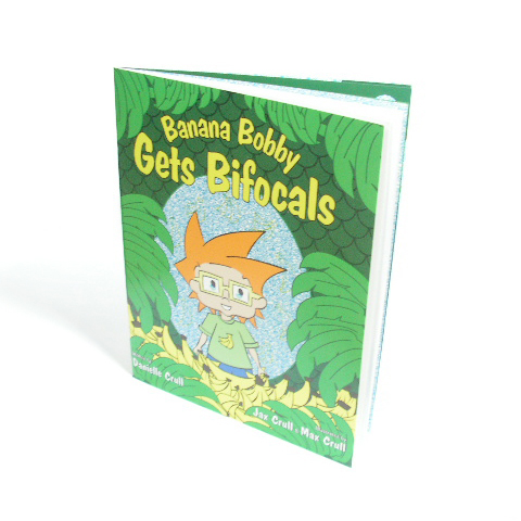Comes with Banana Bobby Gets Bifocals book, a pack of blue stickers for your child's glasses, and a special parents-only solution spy glass. An extra sticker pack may be included for an additional $5.00. You may also have this book personally signed to your child by Danielle Crull.